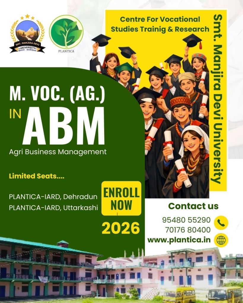 M. Voc. Agriculture – Admission Open – 2026 14 Jan 2026 PLANTICA Leave a comment click here for M. Voc. Agriculture – ABM Share this: Share on X (Opens in new window) X Share on Facebook (Opens in new window) Facebook Like Loading... Related